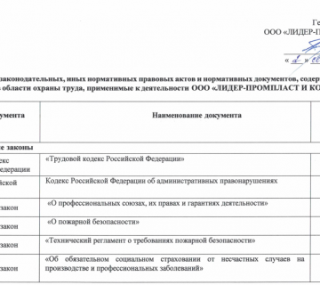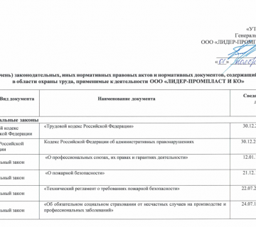 Реестр законодательных, иных нормативных правовых актов и нормативных документов, содержащий требования в области охраны труда, применимые к деятельности ООО «ЛИДЕР-ПРОМПЛАСТ ... Читать далее
